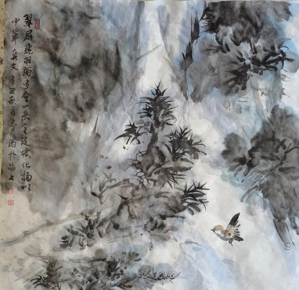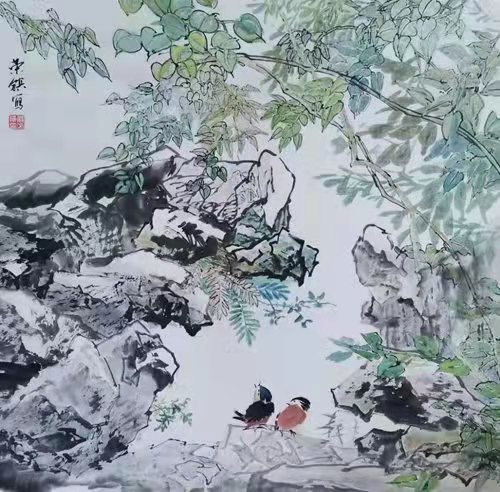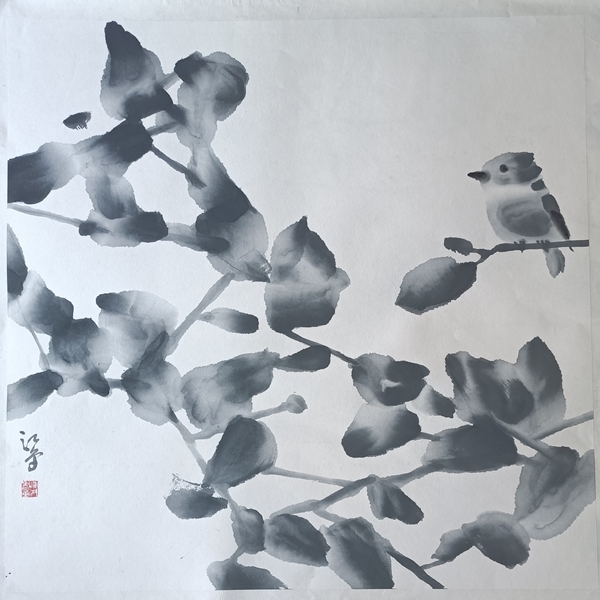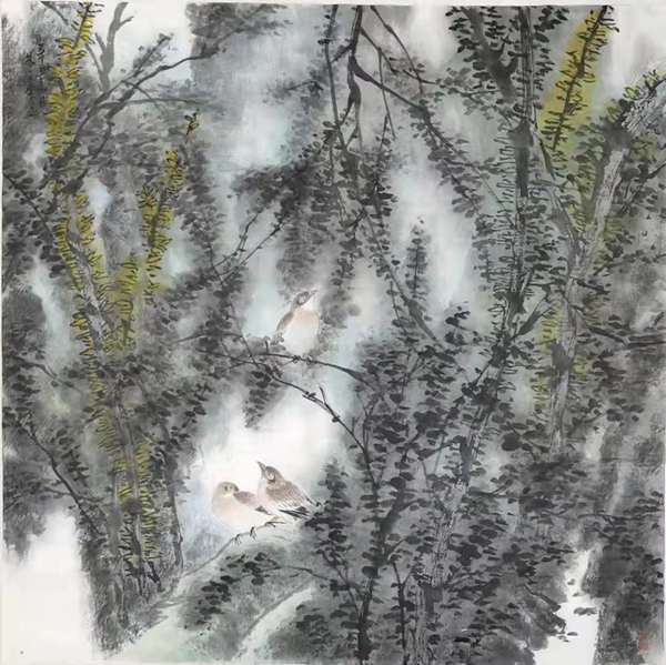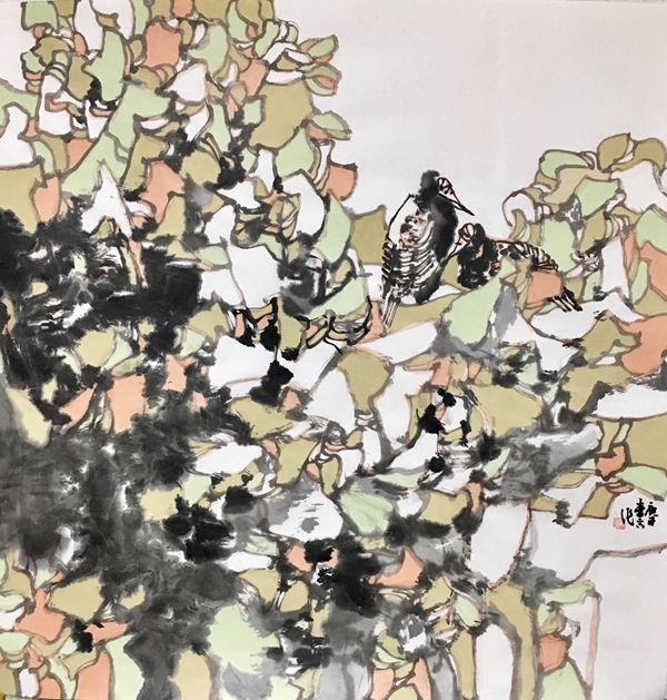 朱白云 鳥鳴 69x69cm