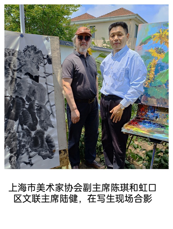 六月驕陽紅似火,六月九日一早六點(diǎn)半,夏建峰開車準(zhǔn)時(shí)到位于曹楊路的陳琪老師工作室接上了陳老師和師母。清晨的上海特別明麗爽朗,城區(qū)的馬路上一路暢通,不到一個(gè)小時(shí)就來到位于六十公里外的奉賢區(qū)青村鎮(zhèn)申隆二村,這里是夏建峰的老朋友顧師傅家的菜地,顧師傅在菜園子里種了幾十棵的向日葵,是專門給夏老師寫生用的。相約而來的還有虹口區(qū)文聯(lián)主席陸健,黃浦區(qū)美術(shù)家協(xié)會執(zhí)行主席隋軍夫婦,油畫家曹怡夫婦,朱順林夫婦,還有女畫家華靜一行等11人,七點(diǎn)半左右大家相約而同都到了目的地,老朋友三月不見都拱手問寒問暖,話題還是疫情防控宅家的三長兩短。由于夏老師事先做了充分準(zhǔn)備,在現(xiàn)場搭好了兩個(gè)遮陽棚,大家很快找好自己寫生的角度,用筆墨、用色彩傾吐解封之后的激悅之情。