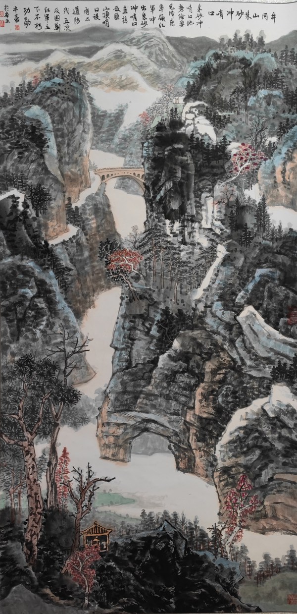 平豪的山水十分開闊,曠野之中又十分靜幽,何以將兩者如此融合,其訣在筆。山水畫的筆勢在近現代受西畫色彩烘染弱化了筆氣,也就是山水畫本身以筆寫山做高古大文章。平豪拿得起這枝筆,千山萬壑,筆筆入勢,縱橫交織氣韻生動,這樣的山就非常壯美,唐宋山水以筆勢為先,唐詩宋詞以格局為氣,都探究藝術造景的本體,所謂筆不掩山,彰顯神韻,氣韻入骨,這樣以筆營造的山就蔥俊萬芳。平豪的山水畫以山勢做文章,如果你是行家里手,觀平豪用筆,筆氣敦厚,層層互映,一派江山如此多嬌。所以,平豪畫山水很早就出名了,上世紀八十年代初正是中國山水在前輩現實主義精神關照下,在開放的氛圍之中研究山水畫本體,平豪又從蕭海春先生,更是如魚得水,他那時對宋元山水的研習不僅是對范寬、王蒙的研究,更是把開放時代中國人重新煥發的寬泛胸懷和對傳承的再認識,一畫宋元朗潤春華,高古絢爛,平豪時有佳作與那些前輩同時展覽。
