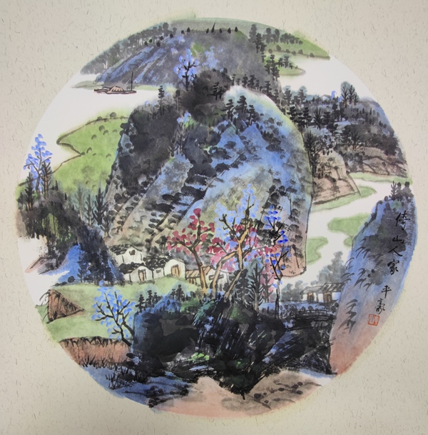 平豪的這幅畫畫的是春山,山岫重巒,依偎生姿,青綠如秀,一派春光明媚。但是,平豪不忘當代畫家,在當代為何畫山水的價值,也就是我們講的山水畫在當代存在的價值。