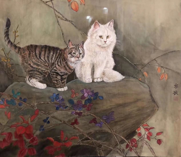 2021年深秋,她參加了一個集上海國畫大家的群展《辛丑回眸》,我特地到魯迅公園旁的朱屺瞻美術館參加開幕活動,在季敏的畫前,嘉賓觀看她的畫作滯留時間是最長的。她參展的是兩幅大尺幅的工筆貓。很多國畫家、主辦人尊稱她“季總”。季敏已經成長為單位里的中層領導了。